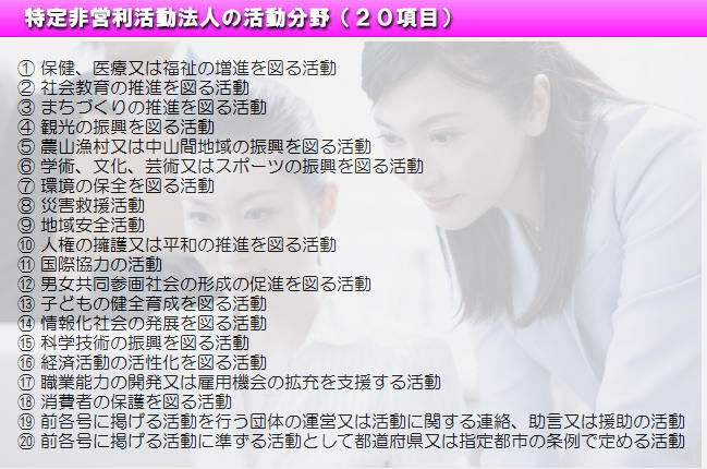 いわゆる会社に勤務する人(従業員という意味の社員)ではありません。 利益配当のない株主みたいな立場です。 特定非営利活動法人(NPO法人)は、公益法人の一形態であり、NPO法は民法の特別法として位置付けられます。 NPO法では、公益的な非営利活動として法人の主たる目的が以下の20分野のどれかに該当していなければなりません。 そのままズバリでなくても問題はなく、運用上はかなり広く解釈されるのが実情です。